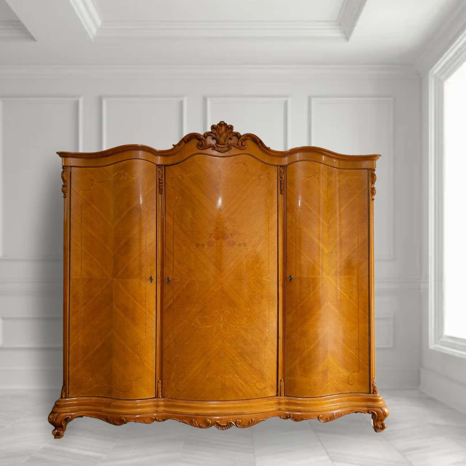 1928-ban készült 3 ajtós intarziás cseresznye szekrény