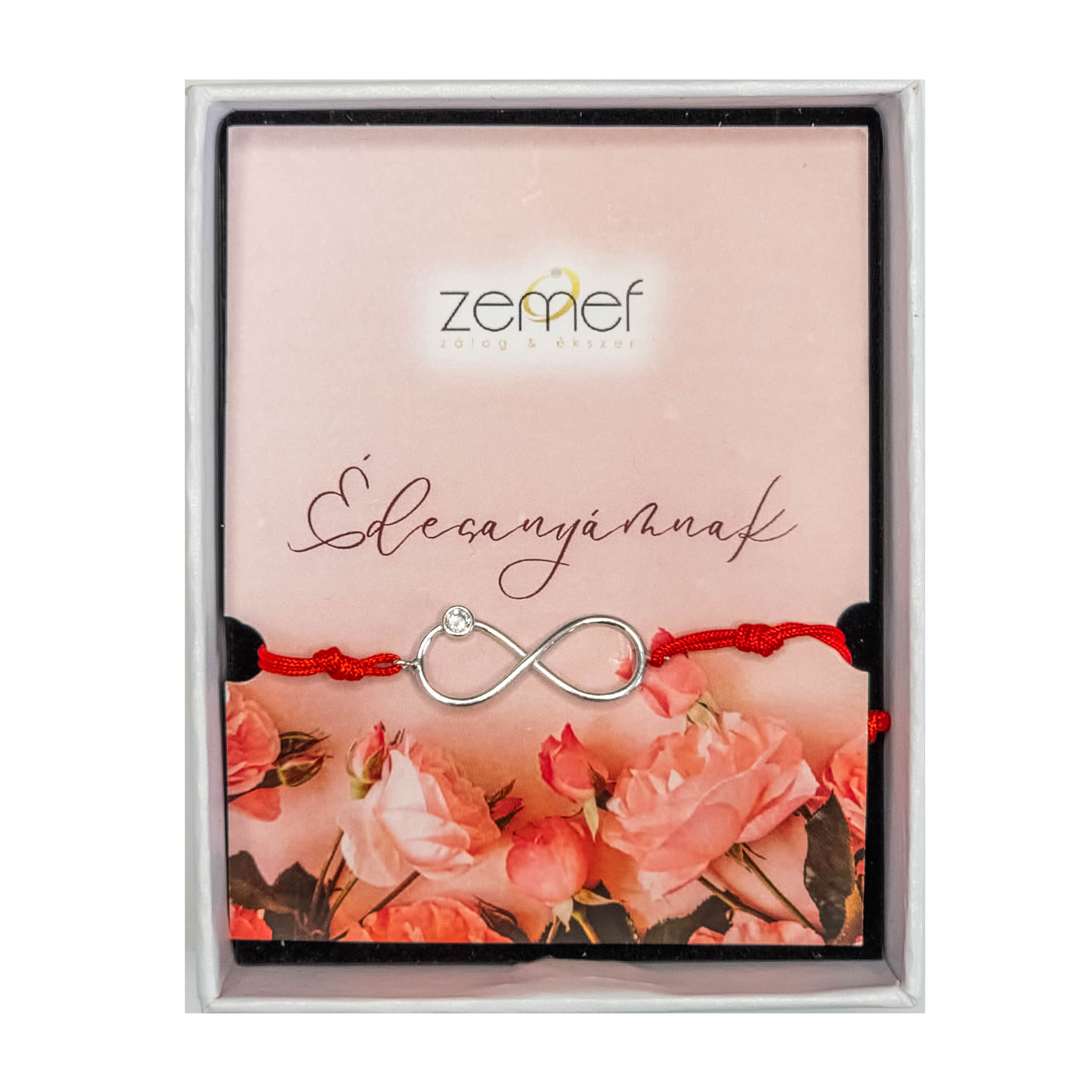 A zsinóros órakísérő ezüst, 925-ös finomságú  végtelen jeles , cirkónia kővel díszítve. A karkötőt választható szöveggel és díszdobozzal együtt postázzuk. Az alábbiak közül válaszd ki a számodra megfelelő üzenet kártyát.