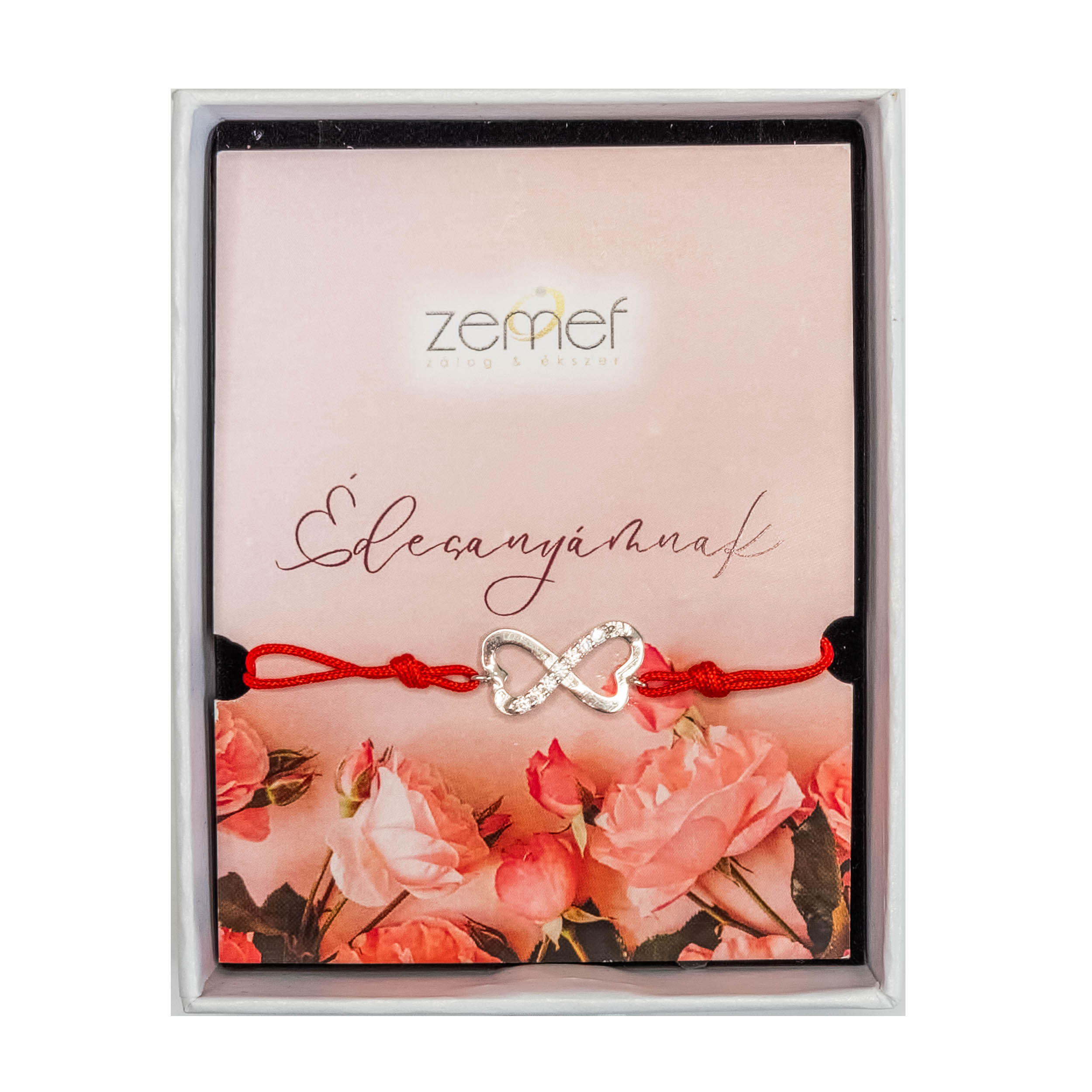 A zsinóros órakísérő ezüst, 925-ös finomságú  végtelen jeles , cirkónia kővel díszítve. A karkötőt választható szöveggel és díszdobozzal együtt postázzuk. Az alábbiak közül válaszd ki a számodra megfelelő üzenet kártyát.