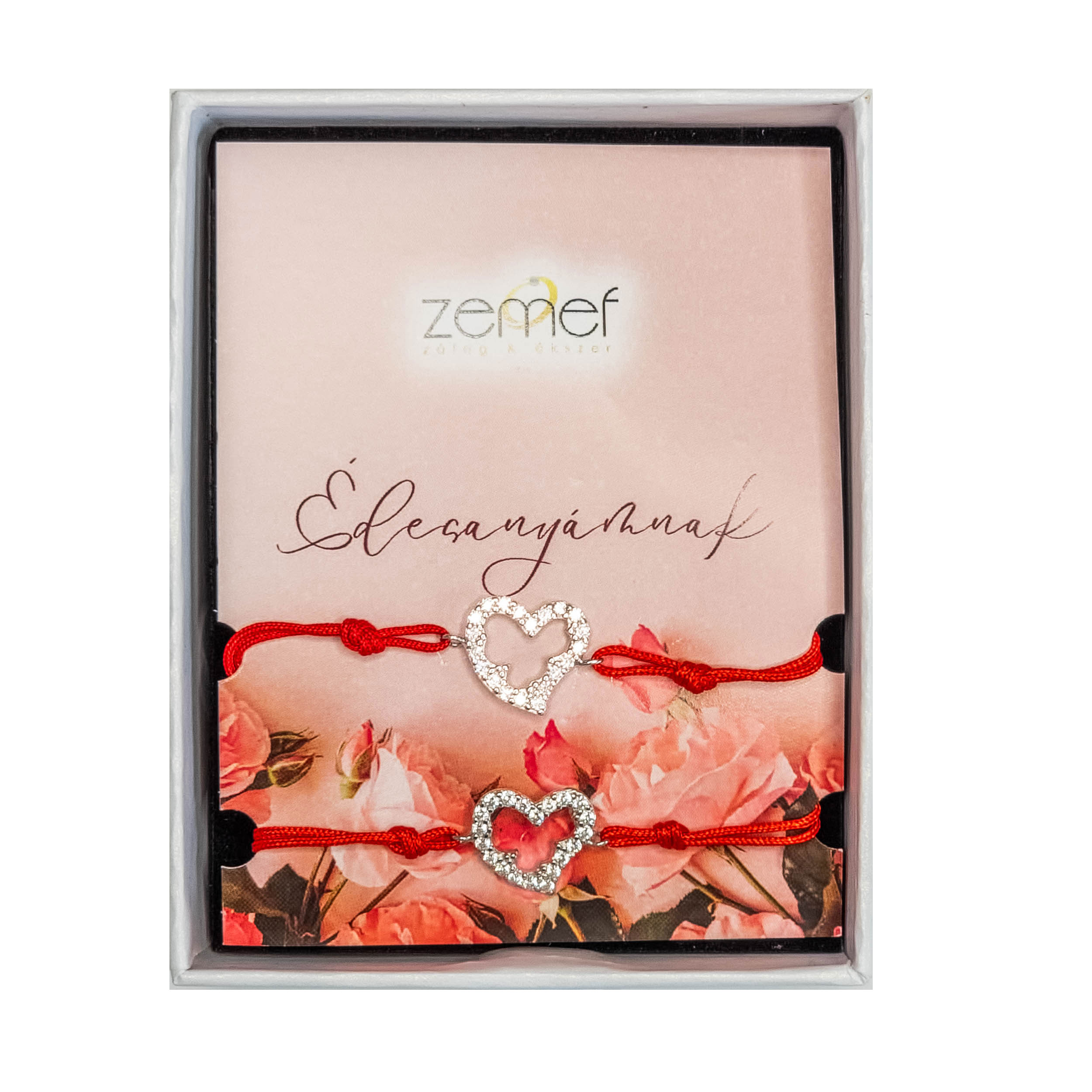 Az ár két karkötőt tartalmaz. A zsinóros órakísérő ezüst, 925-ös bogyókkal és szivecskével díszítve. A karkötőt választható szöveggel és díszdobozzal együtt postázzuk. Az alábbiak közül válaszd ki a számodra megfelelő üzenet kártyát.