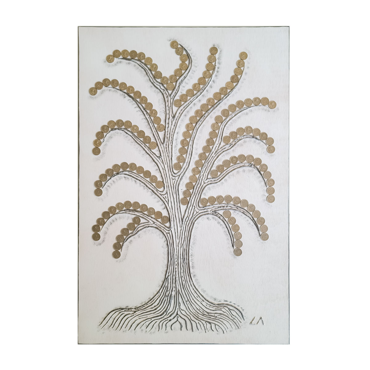 Fehér – ezüst színű pénzfa fali dekoráció érmékkel