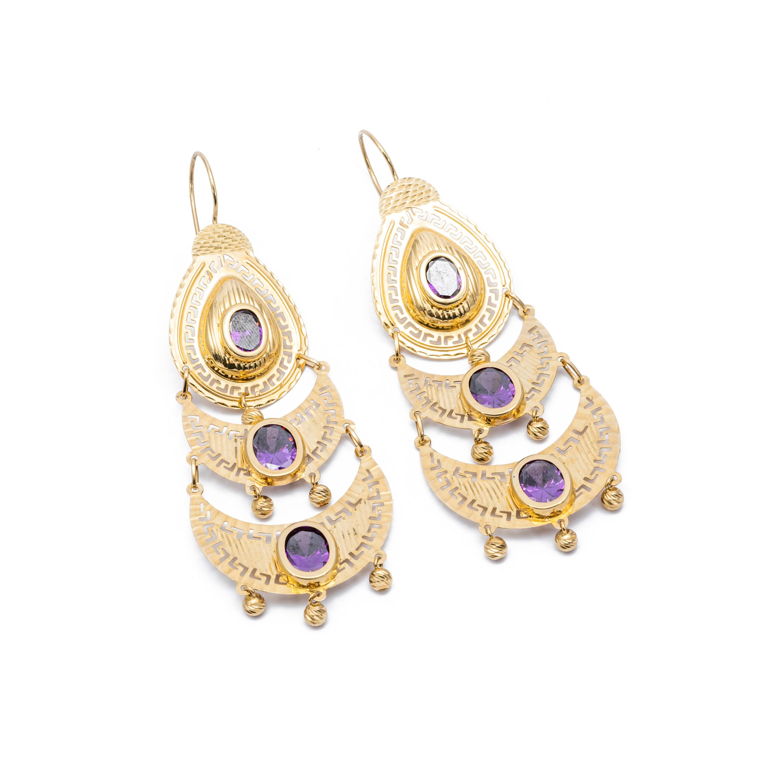 14K Női arany fantázia lógós lila cirkónia köves hátul kapcsos fülbevaló