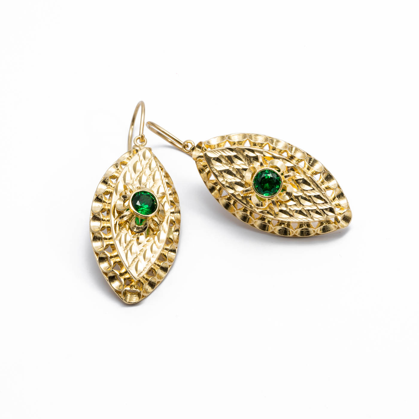 14K Női arany fantázia zöld cirkónia köves elől kapcsos fülbevaló