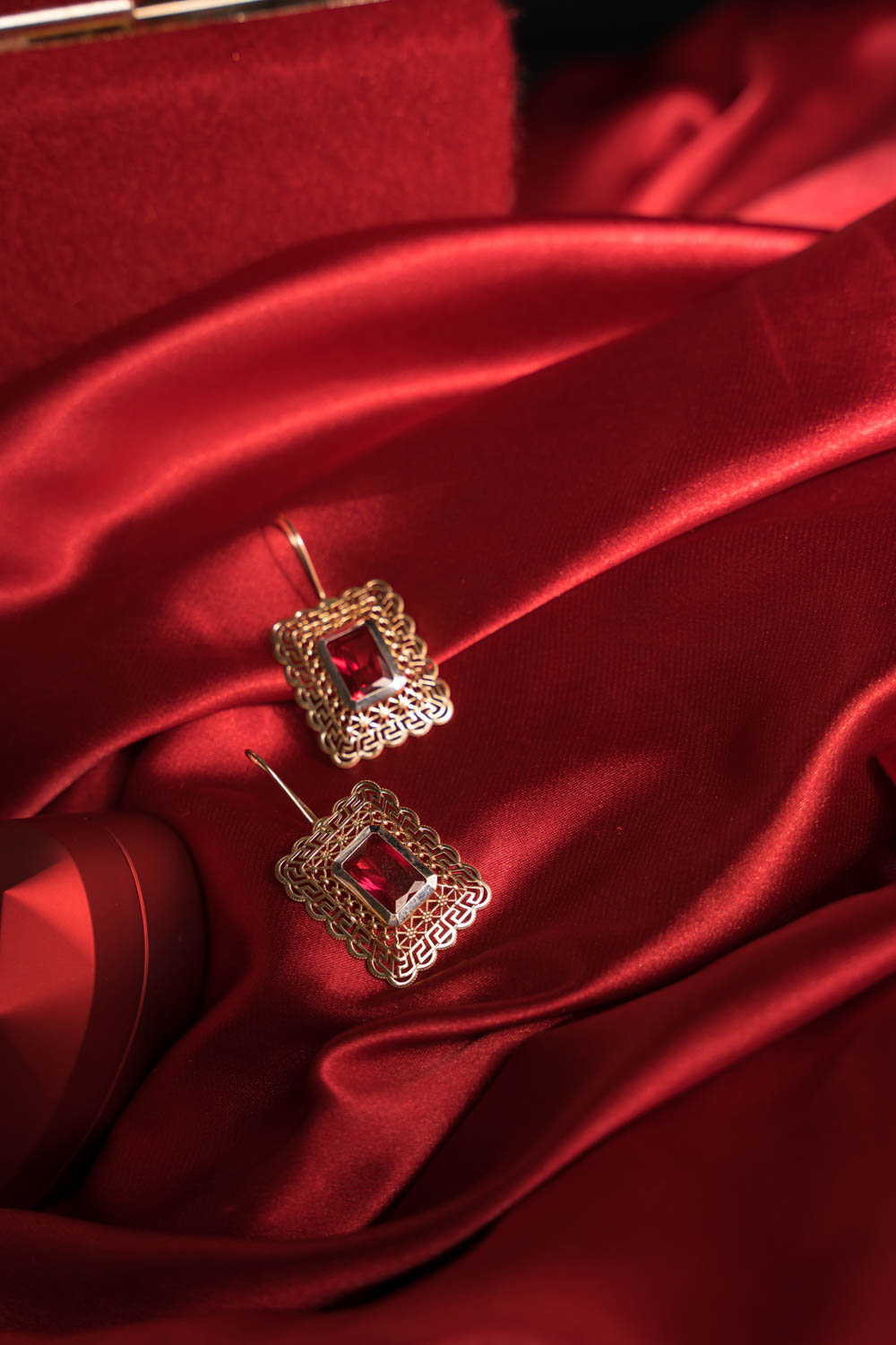 14K Női arany fantázia piros cirkónia köves beakasztós fülbevaló