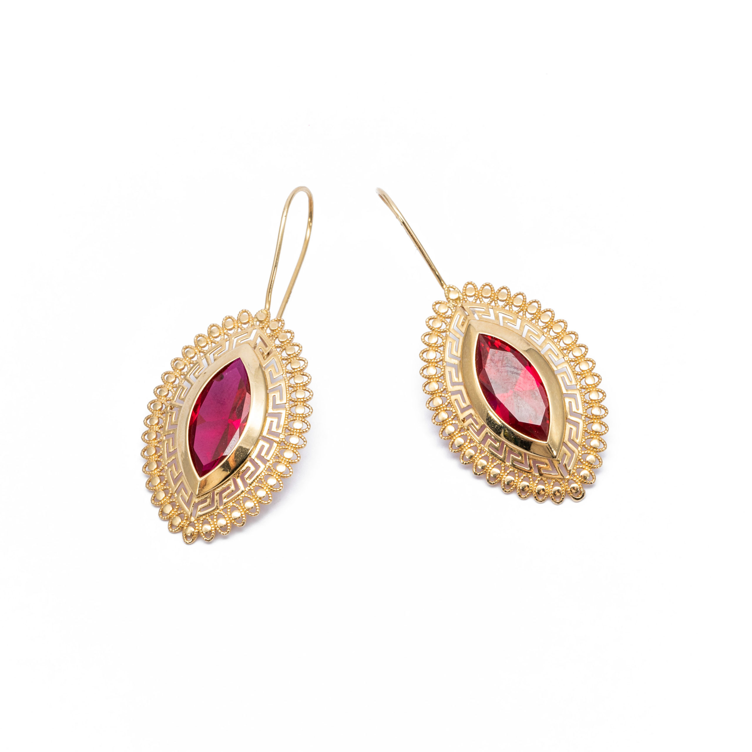 14K Női arany fantázia piros cirkónia köves hátul kapcsos fülbevaló