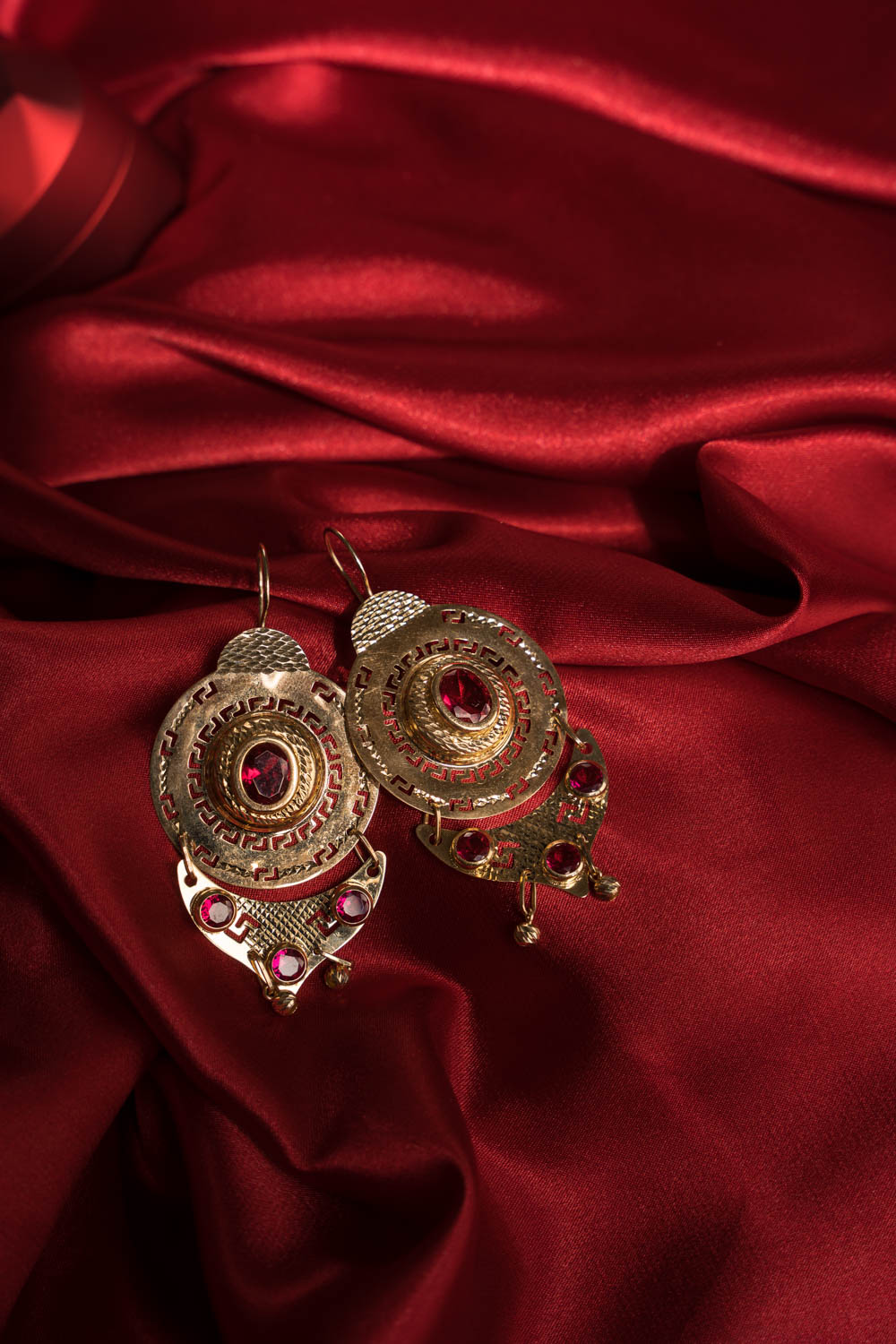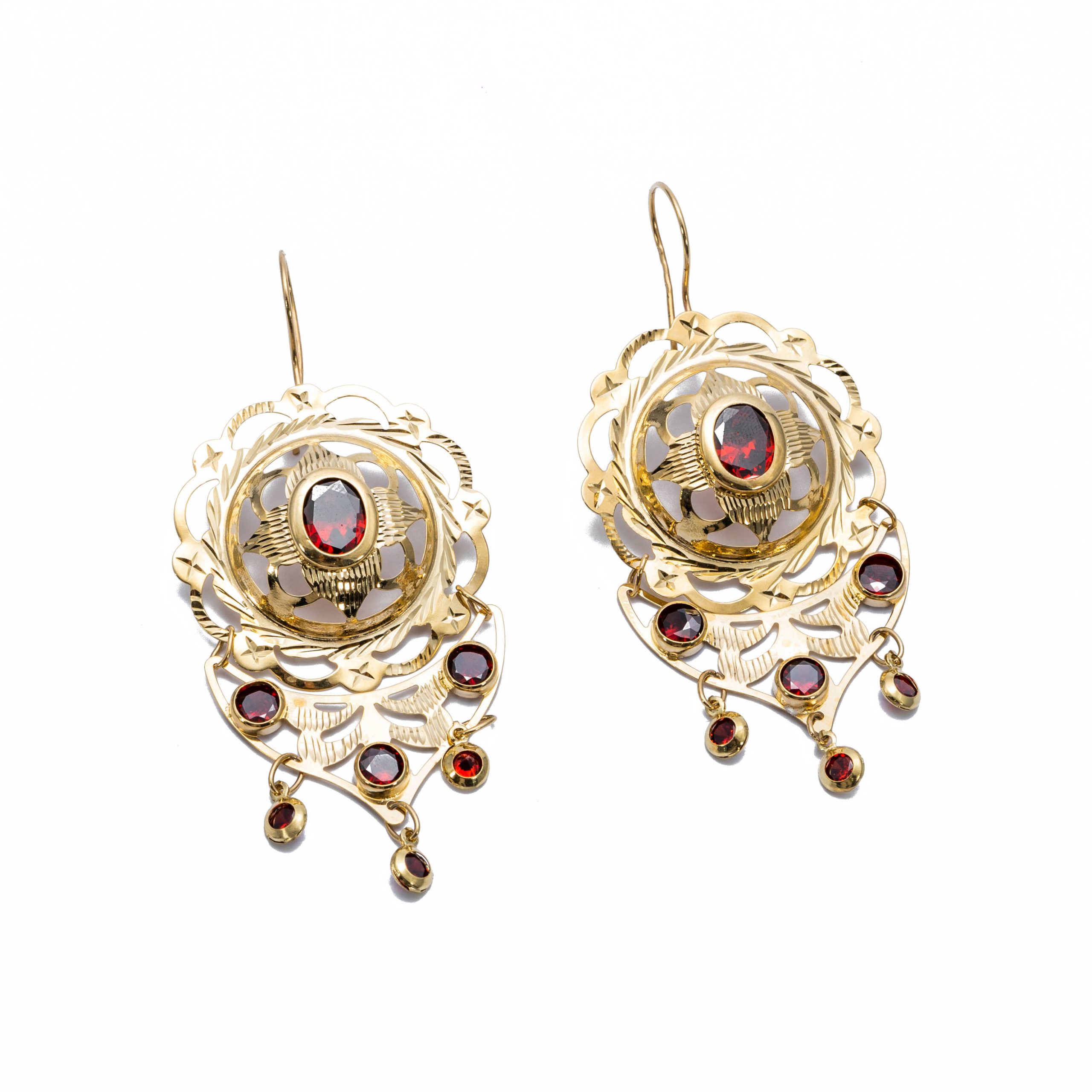 14K Női arany fantázia bordó cirkónia köves beakasztós fülbevaló
