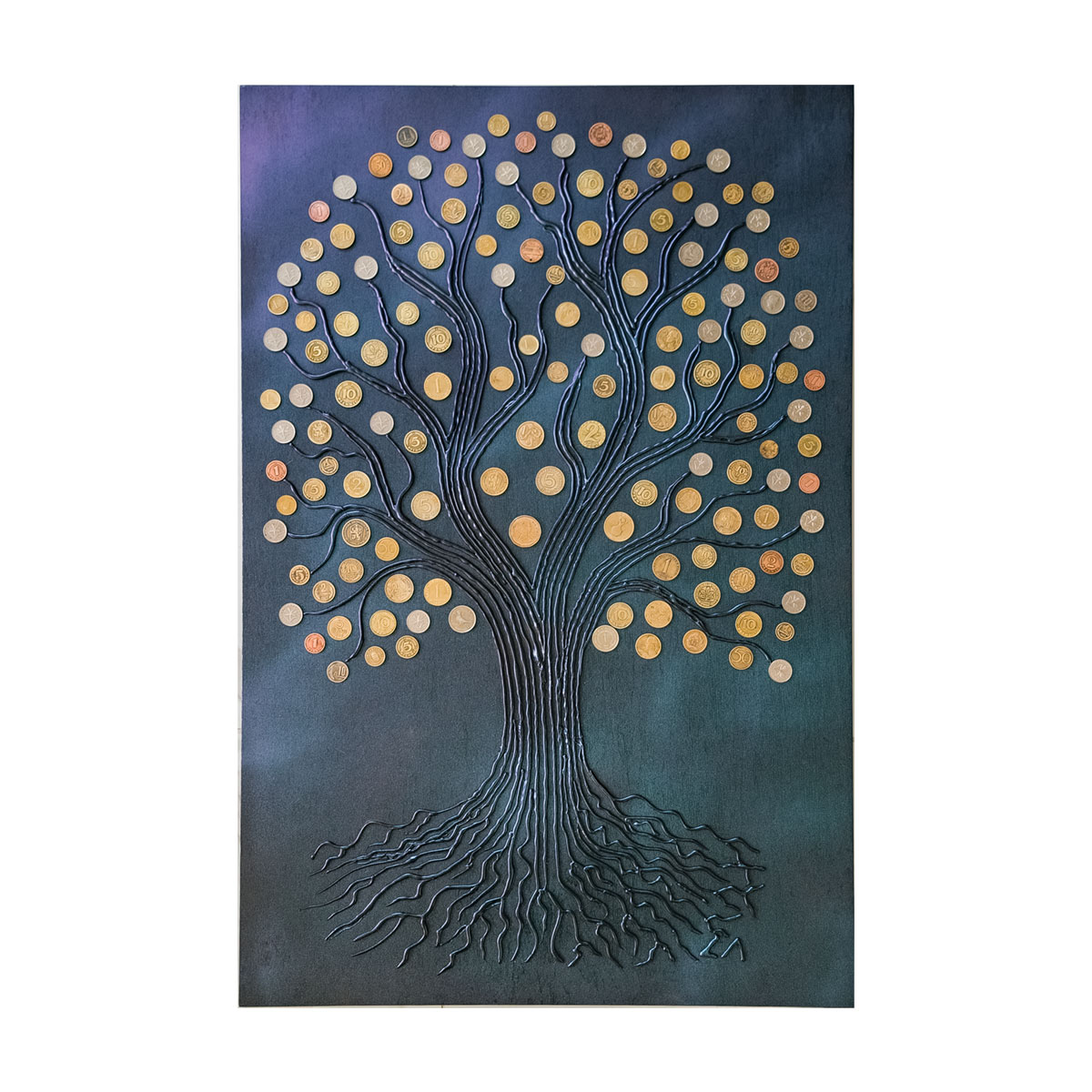 Kék színű pénzfa fali dekoráció érmékkel