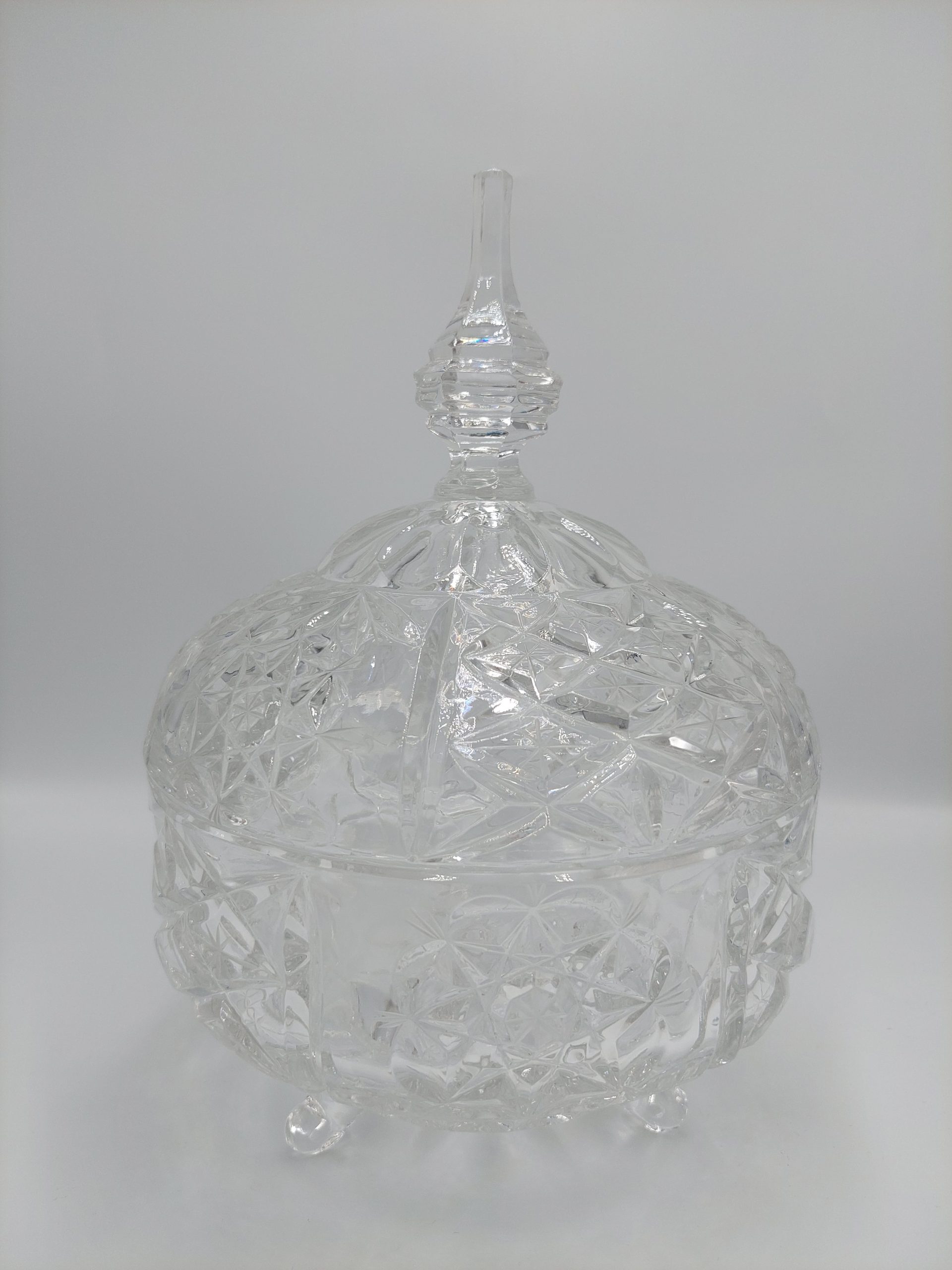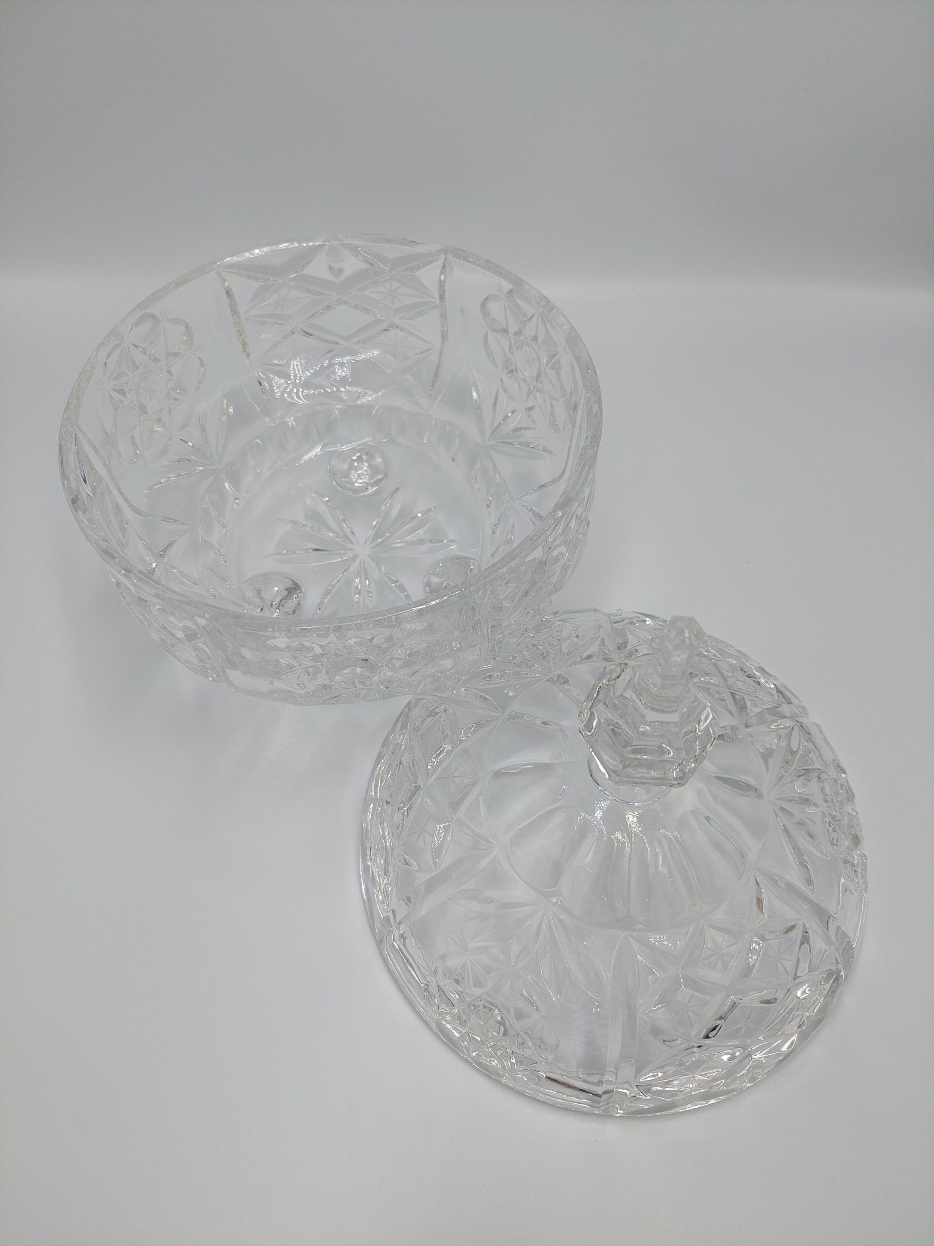 Kristályból készült fedeles bonbonier. Gyönyörű csiszolása hibátlan, teljesen ép, újszerű állapotban. Mérete: 25×17,5