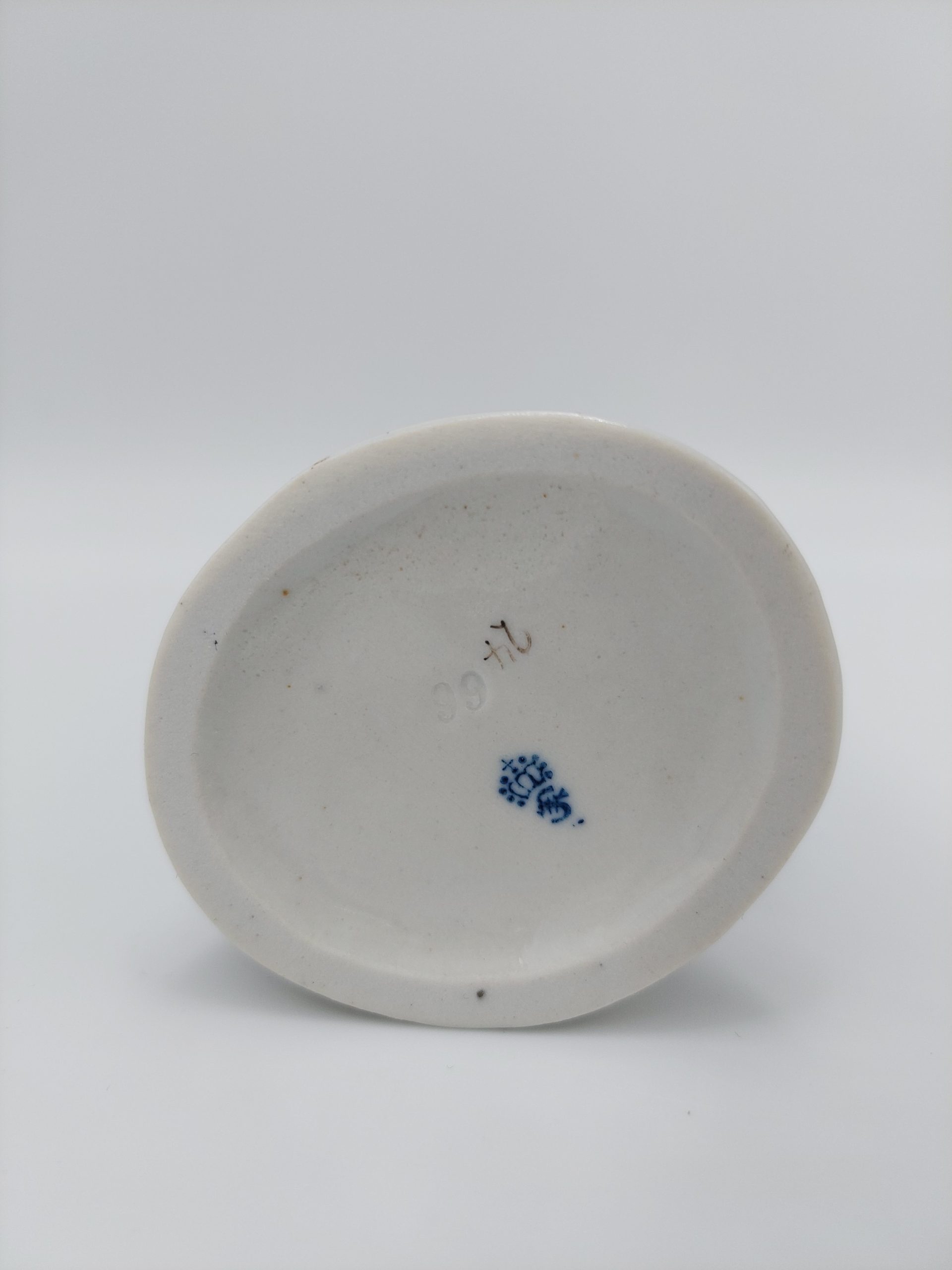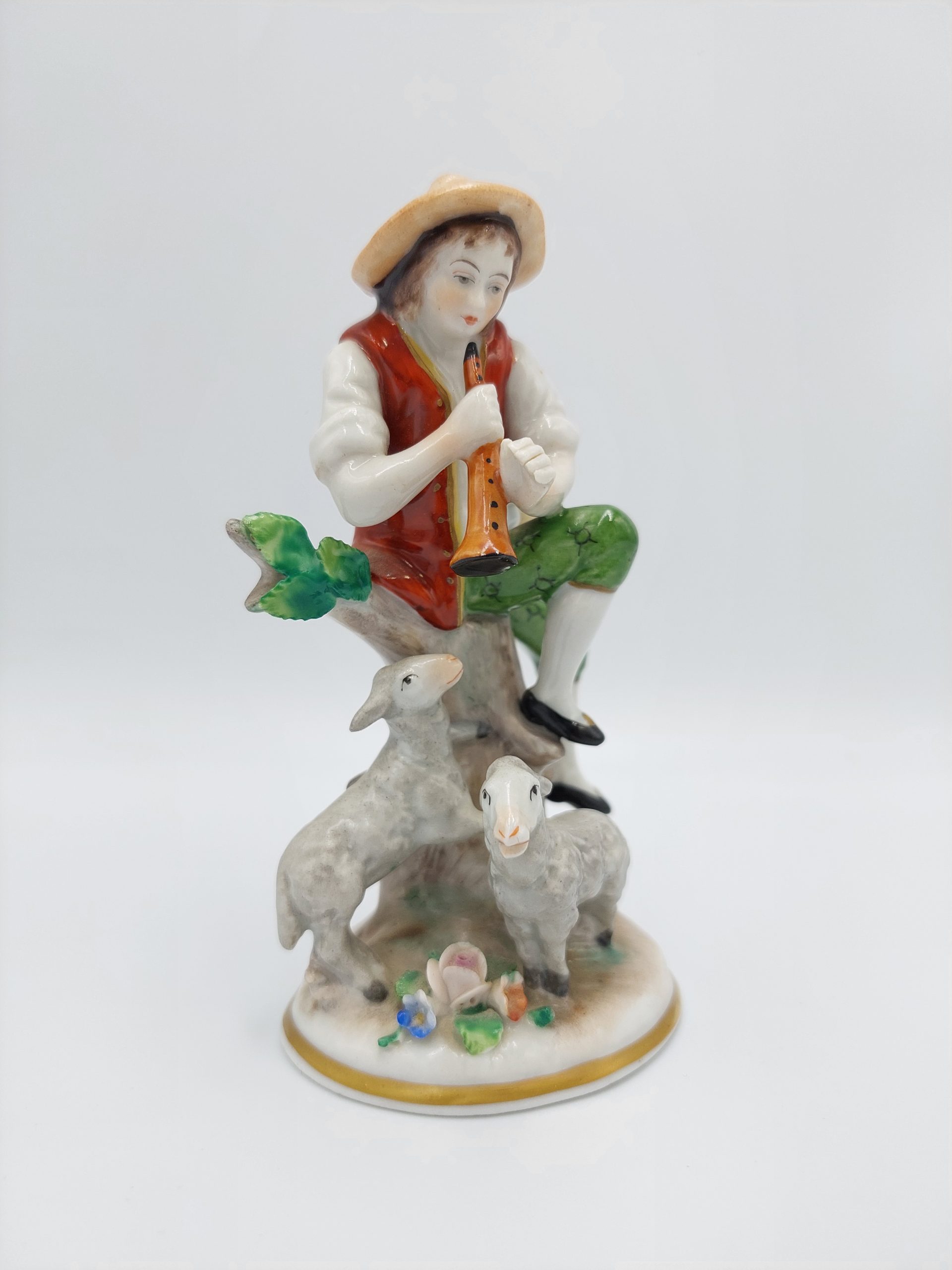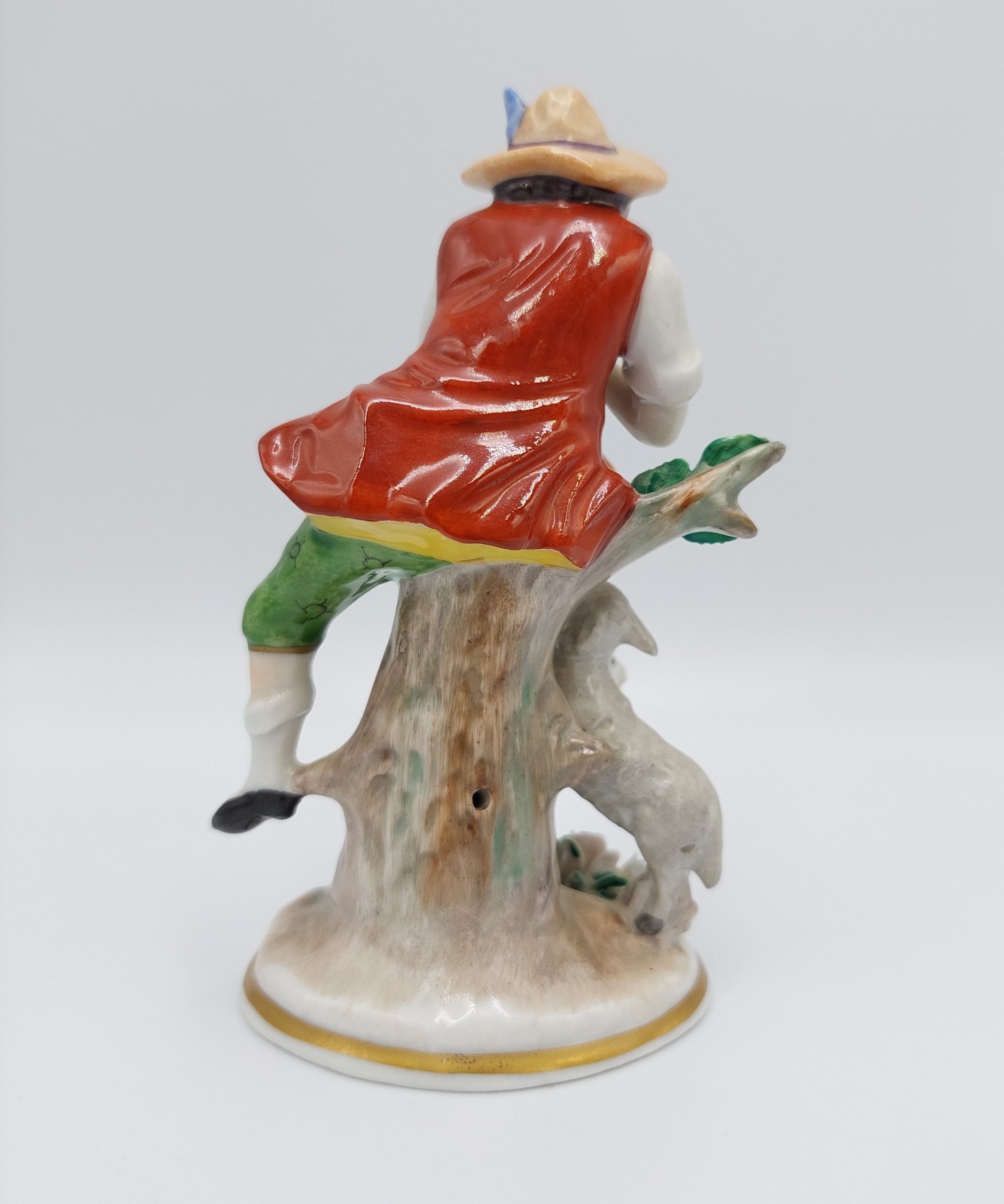 Német porcelán, Furulyázó juhász. Hibátlan, a rózsák, virágok szirmai teljesen épek. Mérete: 12×7 cm