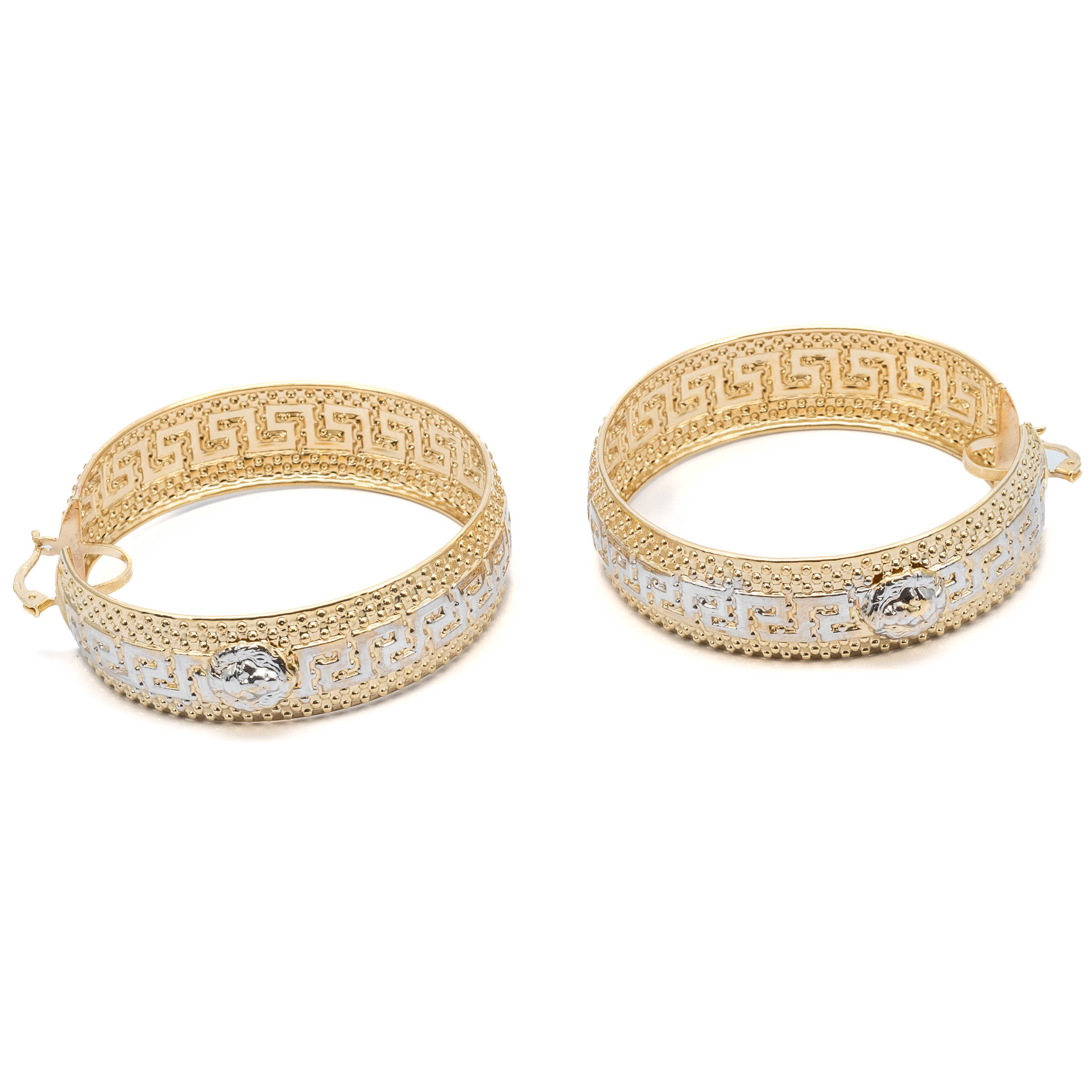 14K Női arany-fehérarany karika görög mintás oroszlán fejes villás kapcsos fülbevaló