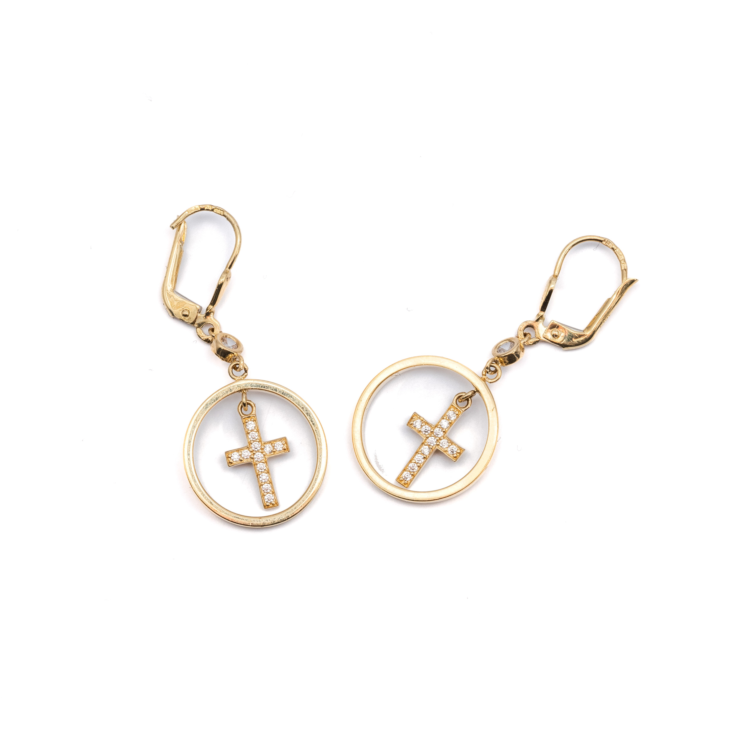 14K Női arany lógós karika kereszt charm cirkónia köves patentzáras fülbevaló