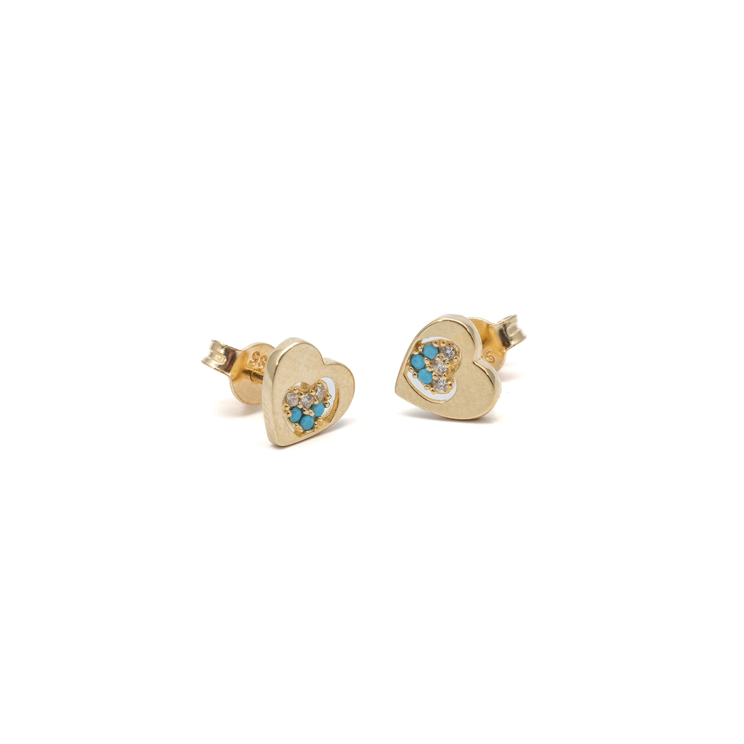 14K Gyerek arany szív mintájú fehér-kék cirkónia köves stekkeres fülbevaló