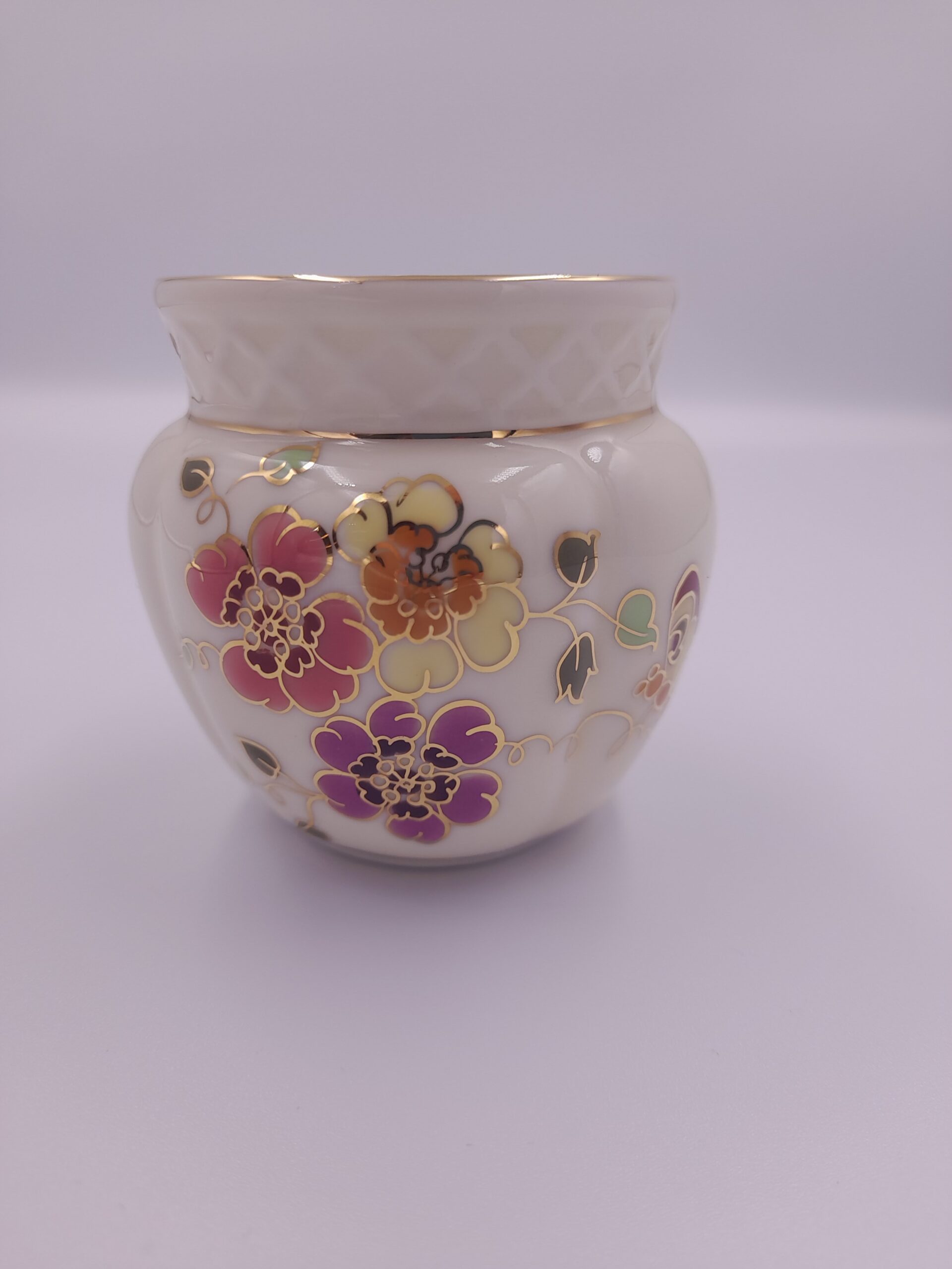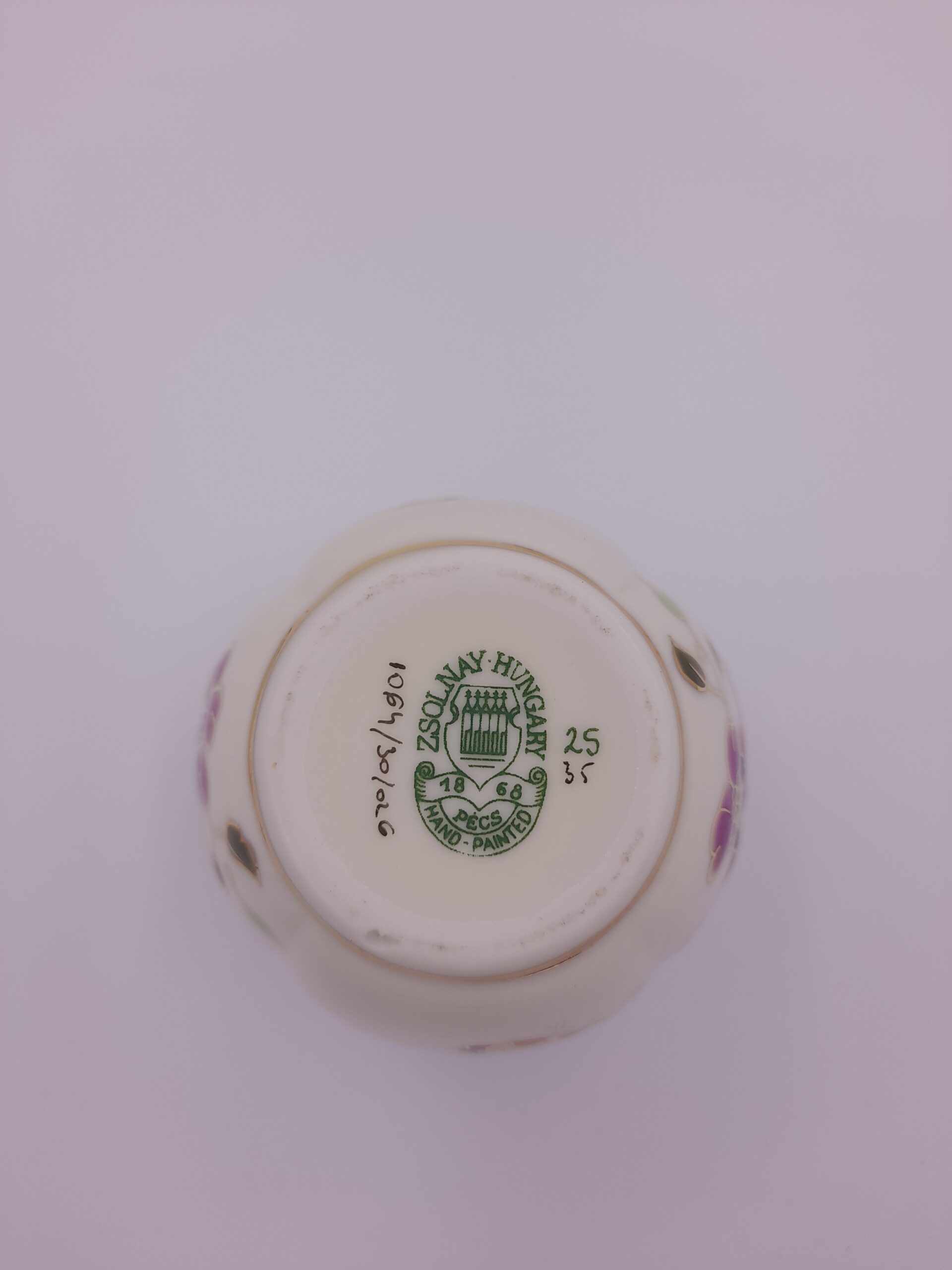 Zsolnay mini kaspó Pillangó mintával. Hibátlan, mázrepedések nélkül, aranyozása és a belső felülete is teljesen ép. Mérete:7×7 cm