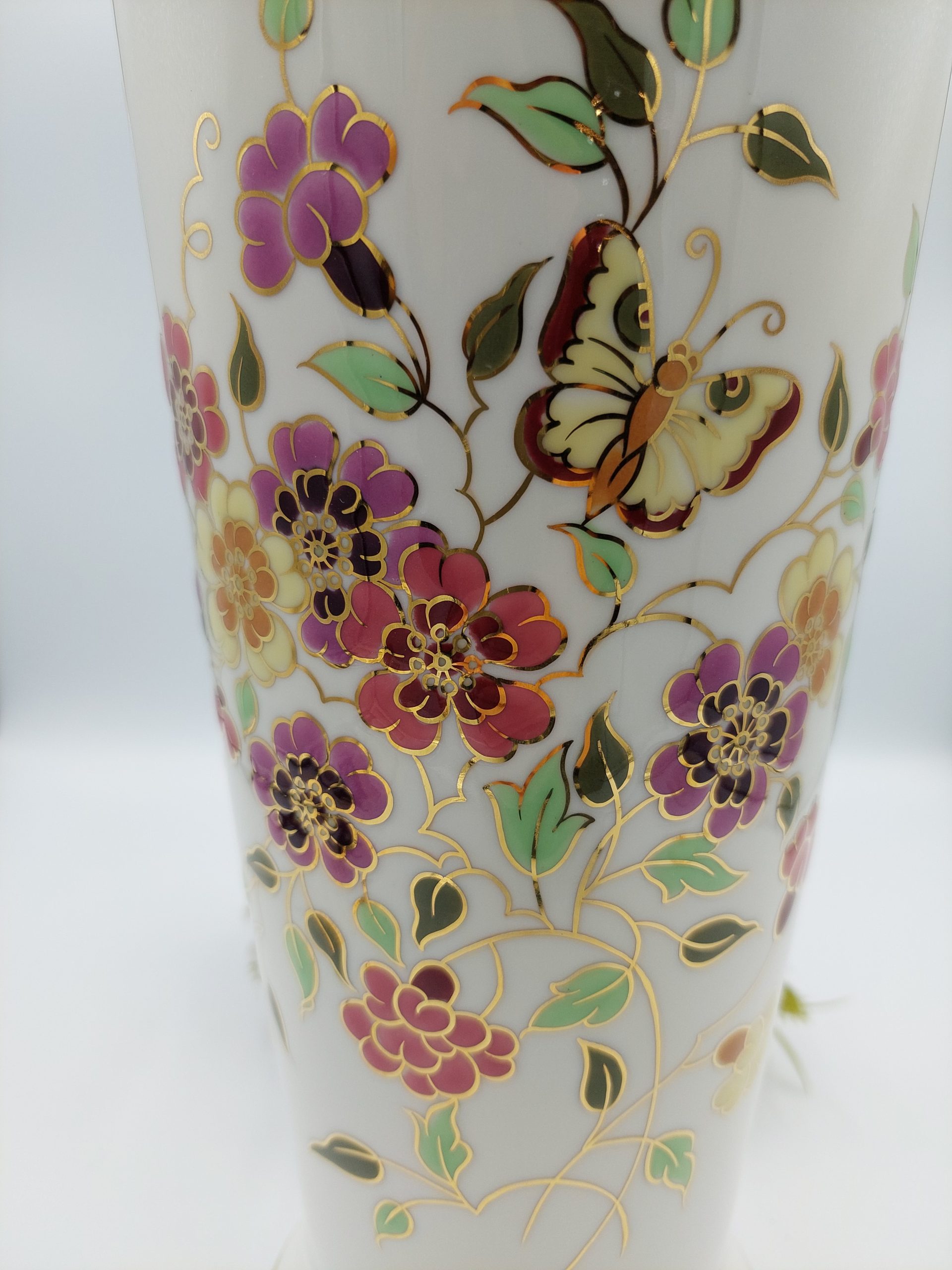 Zsolnay nagyméretű váza, pillangó mintával, mázrepedések nélkül, aranyozása, belső felülete teljesen ép.